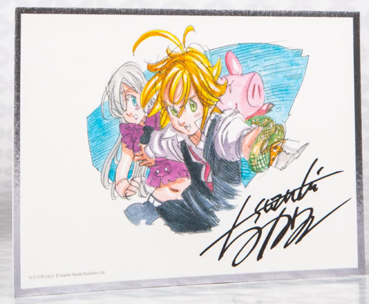 Zum Abschluss der Abenteurer-Reihe »Seven Deadly Sins« legt Carlsen Manga ein farbiges Shikishi von Mangaka Nakaba Suzuki als Extra bei. Ein Bild zum Shikishi findet ihr unten im Artikel. Der 41. Band und zeitgleich letzte Band erscheint am 28. Dezember 2021 zu einem Preis von 6,50 Euro. Die E-Book-Version ist für 4,99 Euro erhältlich.