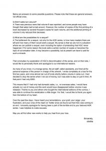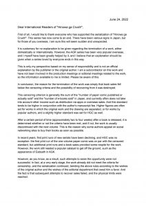 Der Abschluss der Manga-Reihe »Hinowa ga CRUSH!« kam überraschend, weshalb sich Mangaka strelka mit einem Beitrag auf Twitter an alle internationalen Fans der Geschichte wendete. Laut des offenen Schreibens waren die inländischen Verkaufszahlen des Sequels zu »Akame ga KILL!« nicht besonders gut, weshalb die Reihe schon früher hätte beendet werden sollen, jedoch durch den Einfluss von Autor Takahiro und den internationalen Verkäufen noch fortgesetzt wurde.