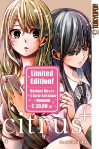 Am 14. September 2022 kommt der vierte Band von »Citrus +« in den deutschen Handel. Neben einer regulären Ausgabe für 8,99 Euro, wird es zudem eine Limited Edition für 20,00 Euro geben. Als Extra dürfen sich die Käufer der limitierten Ausgabe auf ein Variant Cover, einem hübschen Print und zwei Schlüsselanhängern im Chibi-Style freuen. Der regulären Ausgabe wird lediglich das Miniprint beiliegen.