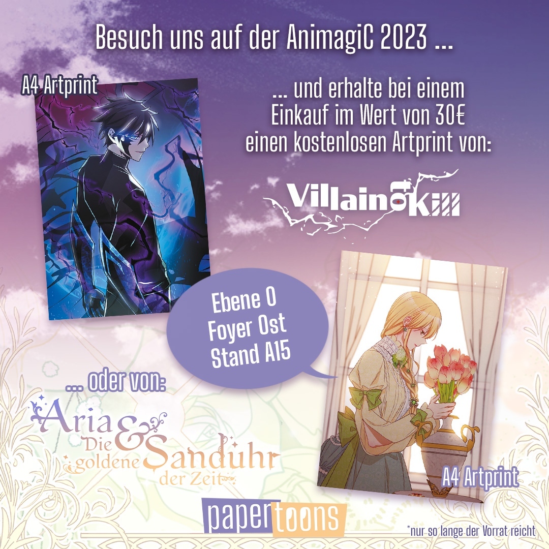 Der junge Webtoon-Verlag papertoons bezieht seinen Stand mit der Nummer A15 im Foyer Ost auf Ebene 0. Im Vorverkauf könnt ihr dort bereits die Neuheiten von August vorfinden, wie den Serienneustart »Villain to Kill«. Wer den Stand mit mindestens zwei Büchern beziehungsweise Waren im Wert von mindestens 30,00 Euro verlässt, darf sich zudem über einen kostenlosen Artprint von »Villain to Kill« oder »Aria & Die goldene Sanduhr der Zeit« freuen.