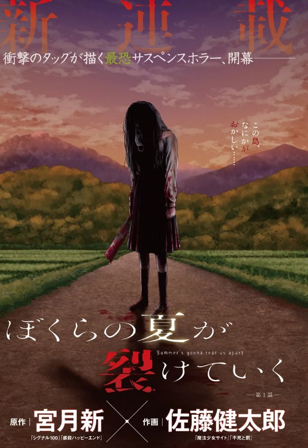 Der »Magical Girl of the End«-Schöpfer Kentarō Satō hat zusammen mit Arata Miyatsuki einen neuen Horrorthriller mit dem Titel »Bokura no Natsu ga Saketeiku« gestartet. Das erste Kapitel erschien in Ausgabe 17 von Hakusenshas »Young Animal«-Magazin. Eine Illustration seht ihr unten.