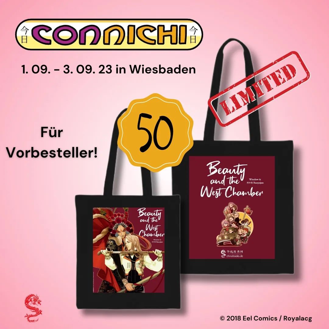 Mit seinen besonderen Manhua-Publikationen ist Chinabooks in diesem Jahr auch auf der Connichi im FOYER NORD am Stand M-10 anzutreffen. Neben spannender Manhua wird es dieses Mal vor Ort ein exklusives Extra geben. So bekommen die ersten 50 Vorbestellungen des Danmei- bzw. Boys-Love-Neustarts »Beauty and the West Chamber« eine bedruckte Stofftasche gratis dazu. Bei der Aktion sind weder Versandkosten noch ein Mindestbestellwert fällig. Schnell sein lohnt sich also. Zudem werden weitere Stofftaschen mit anderen Motiven ab einem Einkaufswert von 40,00 Euro kostenlos ausgegeben. Auch hier gilt, nur solange der Vorrat reicht.