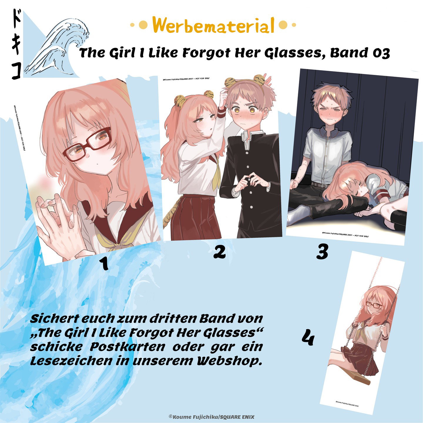 Der Ein-Mann-Verlag Dokico kündigt an, dass Käufer des dritten Originalbandes der RomCom »The Girl I Like Forgot Her Glasses« exklusive Prämienartikel im Verlagsshop ergattern können – natürlich nur, solange der Vorrat reicht. Bilder zu den Goodies haben wir unten für euch.