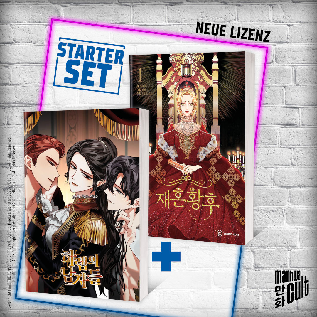 Um die beiden neuen Titel aus der Feder von Alphatart gebührend zu feiern, spendiert Manhwa Cult den Auftaktbänden auch ein praktisches Starterset. Dieses beinhaltet die ersten Printbände von »The Remarried Empress« und »Men of the Harem« und wird zu einem Vorzugspreis von 30,00 Euro zeitgleich zu den Seriennstarts in den Handel kommen.