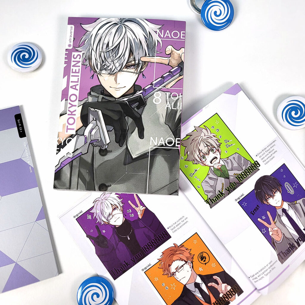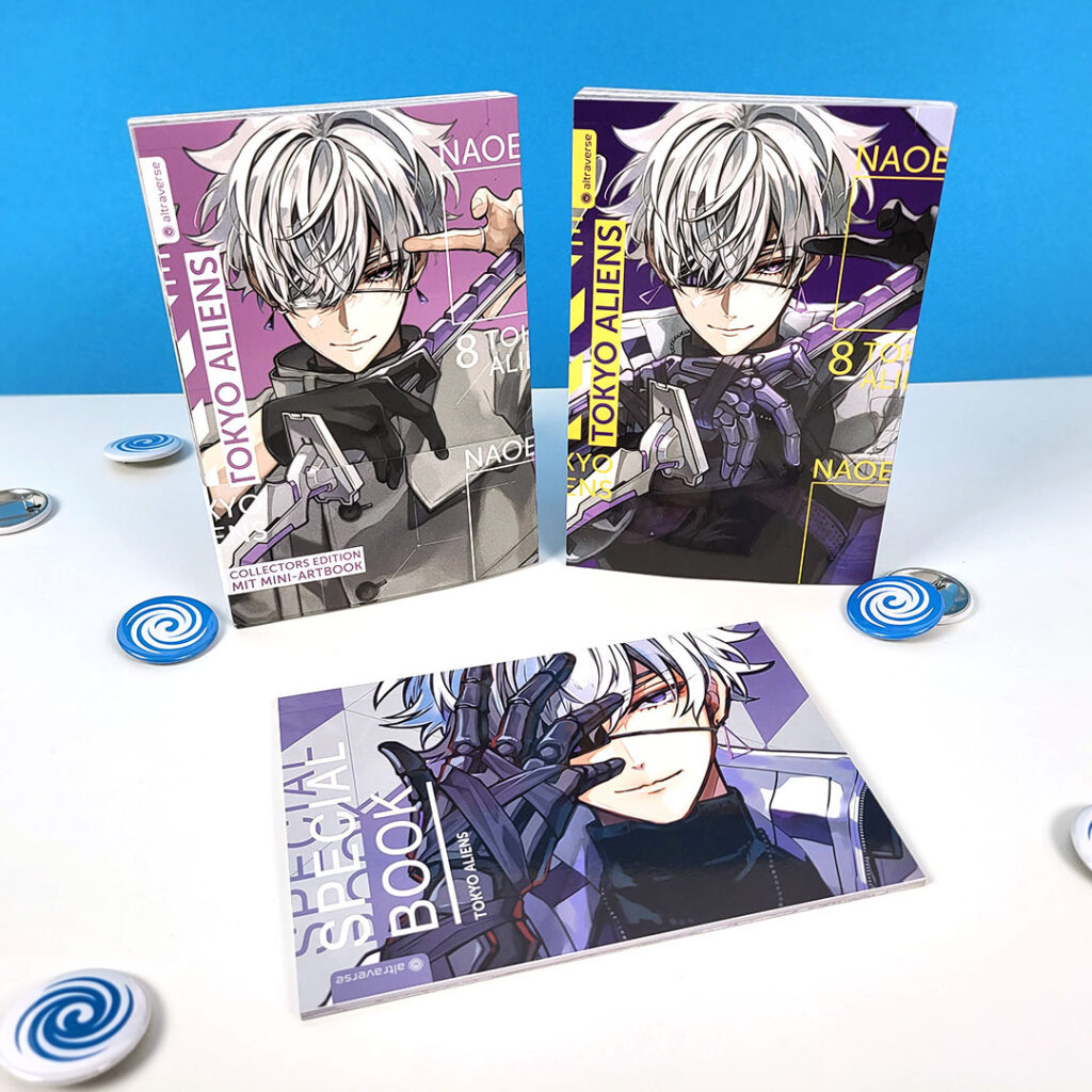 Der achte Band von »Tokyo Aliens« lässt sich seit dem 10. Juni in der Standardausgabe für 8,00 Euro oder als Collector’s Edition zu einem Preis von 15,00 Euro erwerben. Bei letztgenannter Variante wird den Käufern ein Variant Cover und ein Mini-Artbook als Extra geboten. In dem Mini-Artbook gibt es ein Bonus-Manga, Illustrationen und Kommentare von Mangaka NAOE.