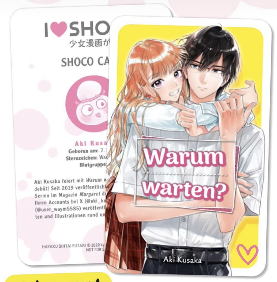 Der deutsche Verlag TOKYOPOP startet in Kürze den Release seines Shōjo-Neustarts »Warum warten?« (jap.: »Hayaku Shitai Futari«). Für Käufer der Erstauflage liegt dem ersten Band eine der heiß begehrten ShoCo Cards bei. Ein Bild dazu haben wir unten.