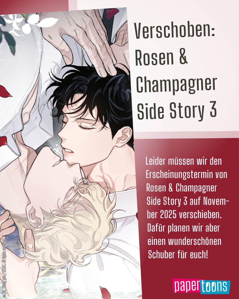 Der Webtoon-Verlag papertoons hat mal wieder keine Mühen gescheut und kündigt einen zweiten Sammelschuber zur Side Story der fesselnden Boys-Love-Reihe »Rosen & Champagner« (orig. »Jangmiwa Champagne«) an.