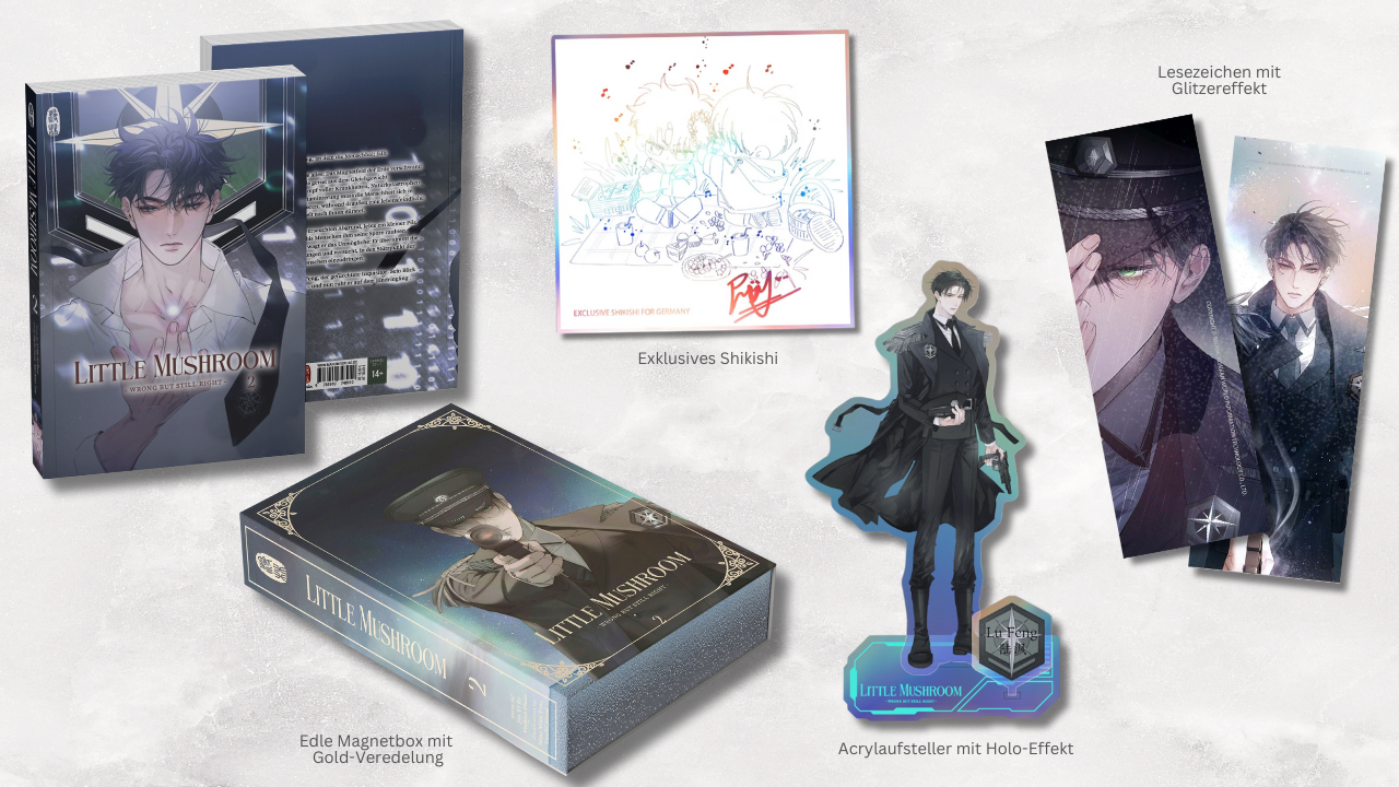 Manlin plant, den zweiten Band von »Little Mushroom« im Januar 2026 zu veröffentlichen. Wie schon beim Auftakt wird es zwei Ausgaben geben: eine reguläre Edition für 18,00 Euro sowie eine Special Edition für 45,00 Euro. Letztere erscheint in einer Magnetbox mit Goldveredelung und enthält zusätzlich ein Shikishi, ein Lesezeichen mit Glitzereffekt sowie einen Acrylaufsteller mit Holo-Effekt.