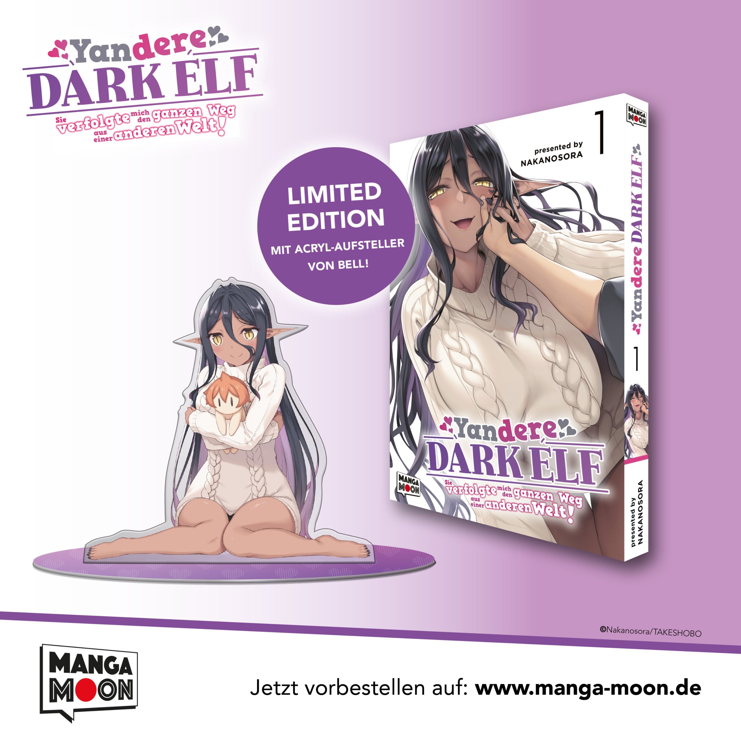 MangaMoon bereitet den Start der deutschen Ausgabe der Ecchi-Komödie »Yandere Dark Elf« (jap.: »Chotto dake Ai ga Omoi Dark Elf ga Isekai kara Oikakete Kita«) vor. Der erste Band erscheint Ende Oktober. Nun lässt sich auch ein erster Blick auf den Acrylaufsteller der Limited Edition werfen – das passende Bild findet ihr unten im Artikel.