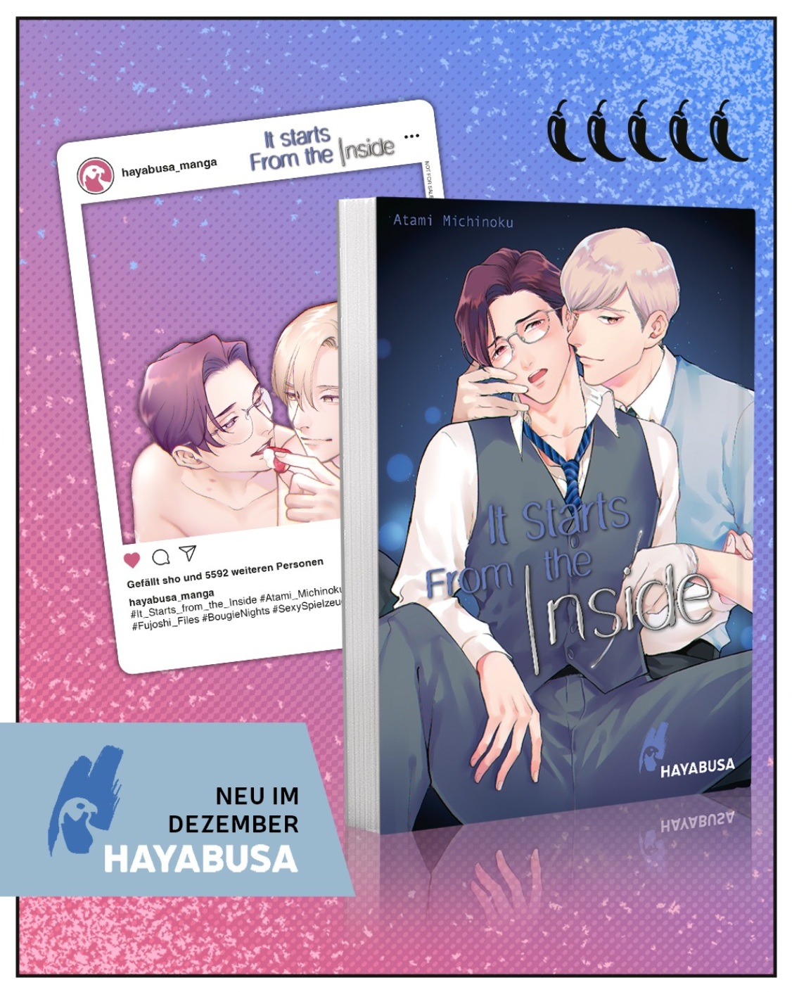In Japan wurde »It Starts From the Inside« bereits 2016 von Magazine Magazine in dessen »Boy’s Pierce«-Magazin veröffentlicht. Für Fans des Genres ist Schöpferin Atami Michinoku längst keine Unbekannte mehr. Unter anderem sind bei Hayabusa auch »Sayonara Red Beryl«, »Die Rippe des Adams« samt Luxus Edition, »Yakuza Angel« und künftig »Hanayukaba« erschienen.